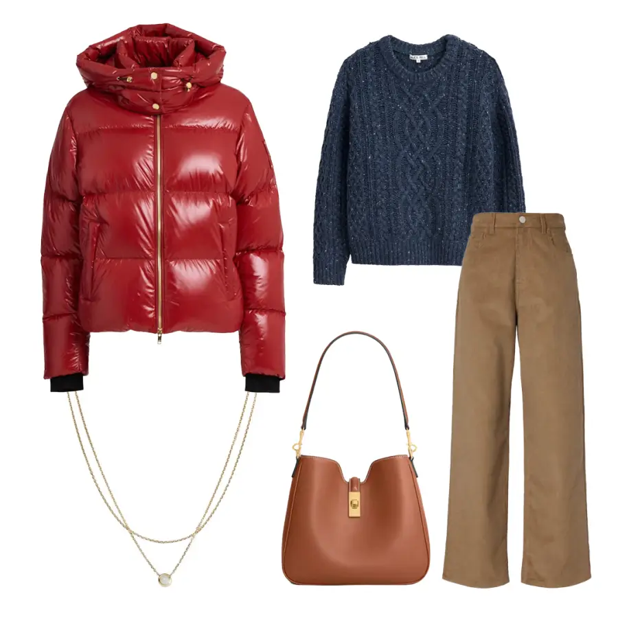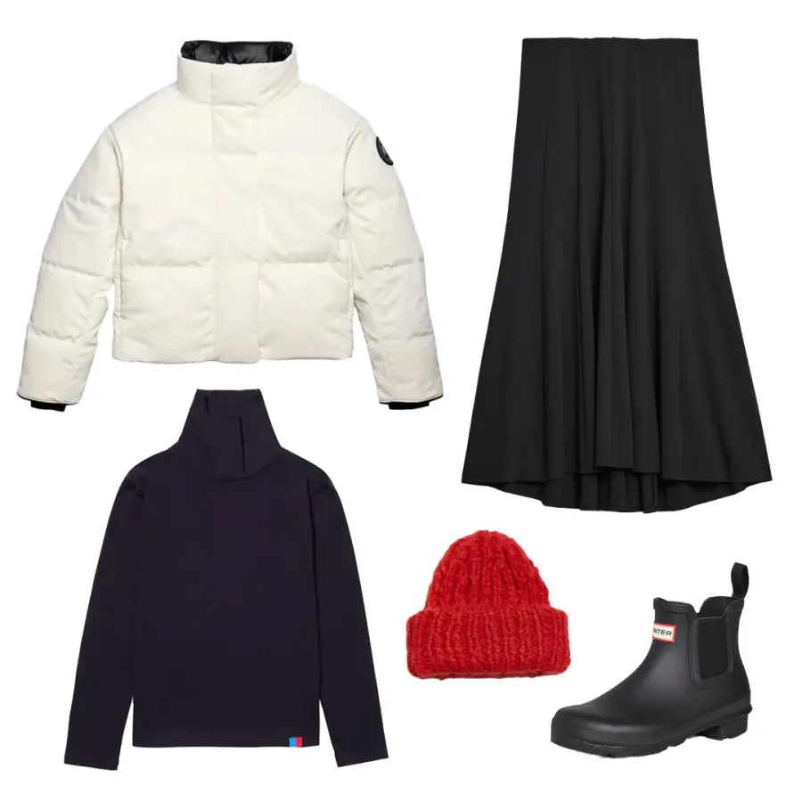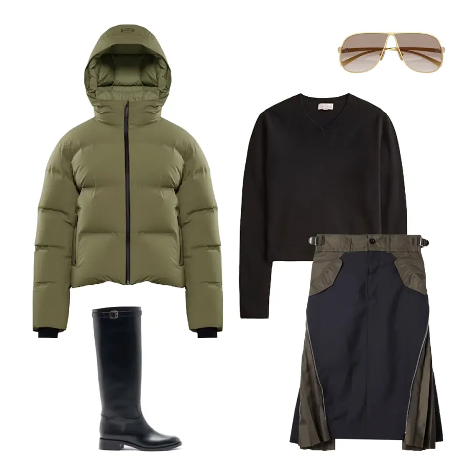 Apuesta por la naturaleza funcional de la puffer combinándola con prendas que compartan esa misma practicidad. Una bota plana de caña alta ayuda a “invernizar” faldas y shorts que normalmente reservas para el verano o comienzos del otoño, mientras que un suéter de cashmere funciona como una capa base ideal que hace que vestirse en invierno sea mucho más llevadero.