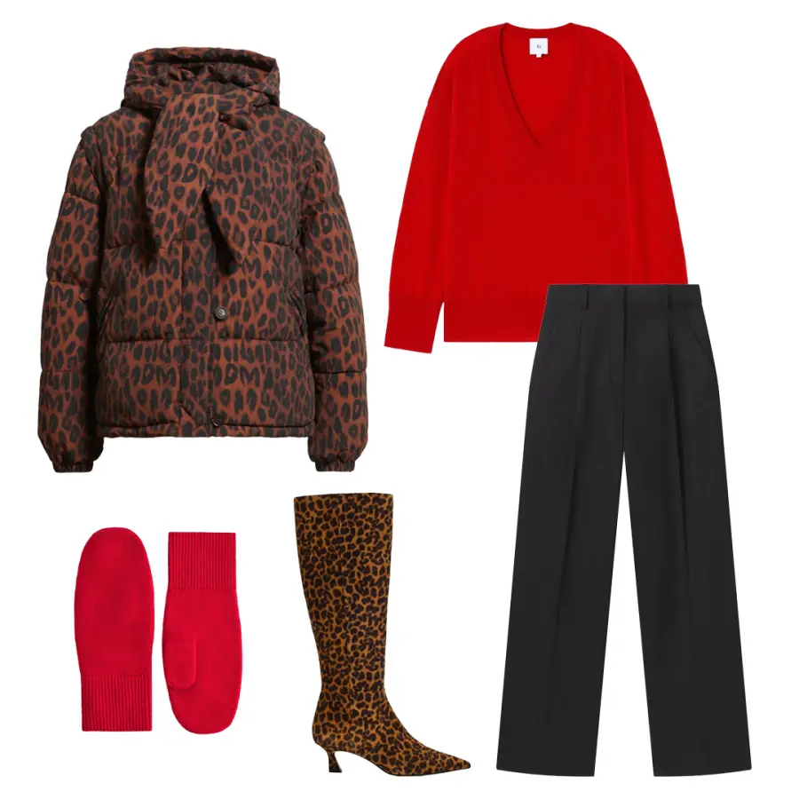 Otra forma de renovar tu colección de puffers es optar por una con estampado interesante. El animal print, especialmente el leopardo, lleva varias temporadas en tendencia y todo indica que llegó para quedarse. Si quieres experimentar con patrones sin perder atemporalidad, este motivo es una gran opción. En lugar de combinarlo con una base completamente negra, juega con colores complementarios o mezcla otro estampado para que el outfit destaque aún más.