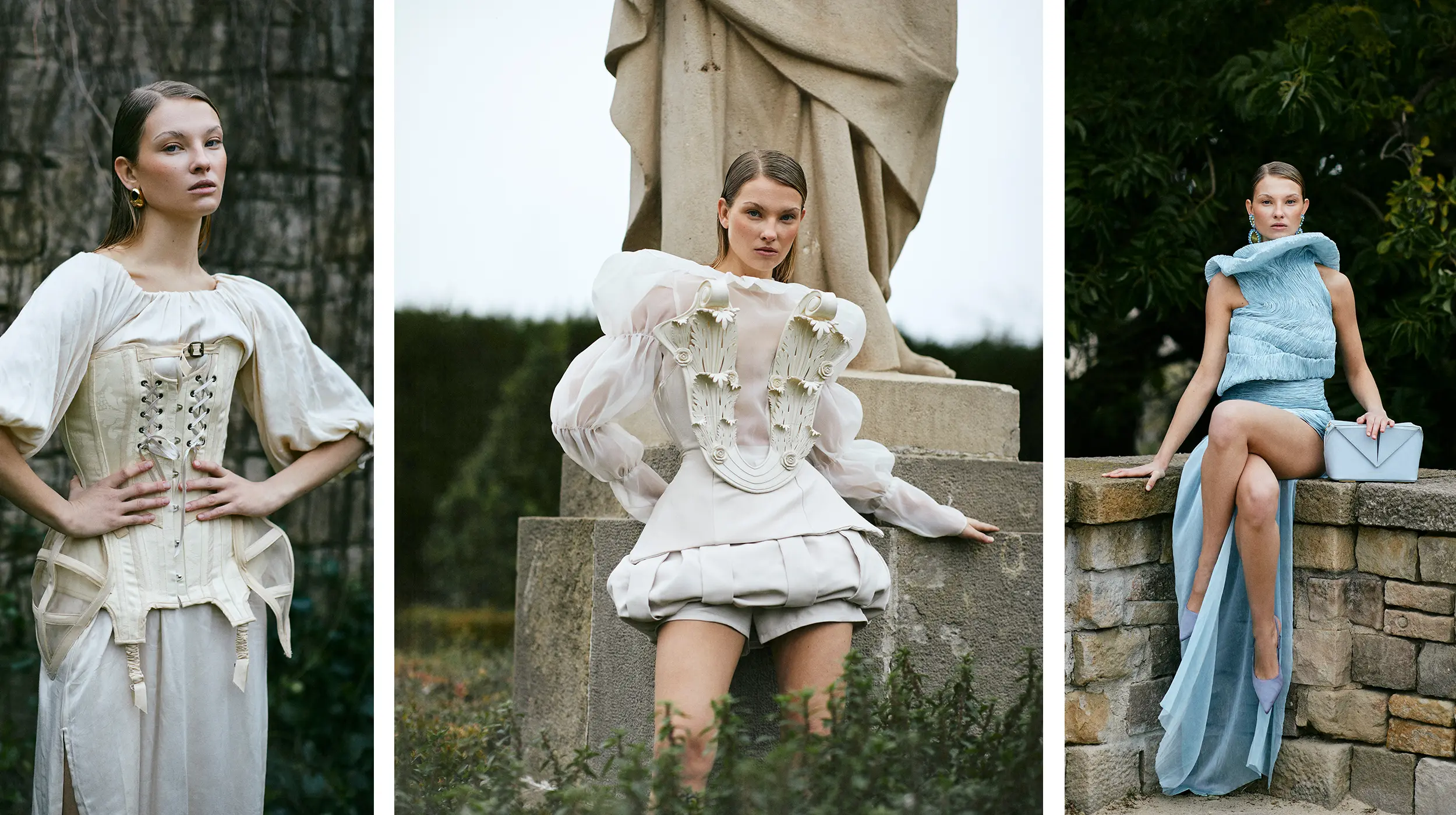 Un diálogo entre naturaleza y alta moda: corsetería, transparencias y capas en movimiento toman el parque como escenario para revelar fuerza, delicadeza y precisión en cada silueta.