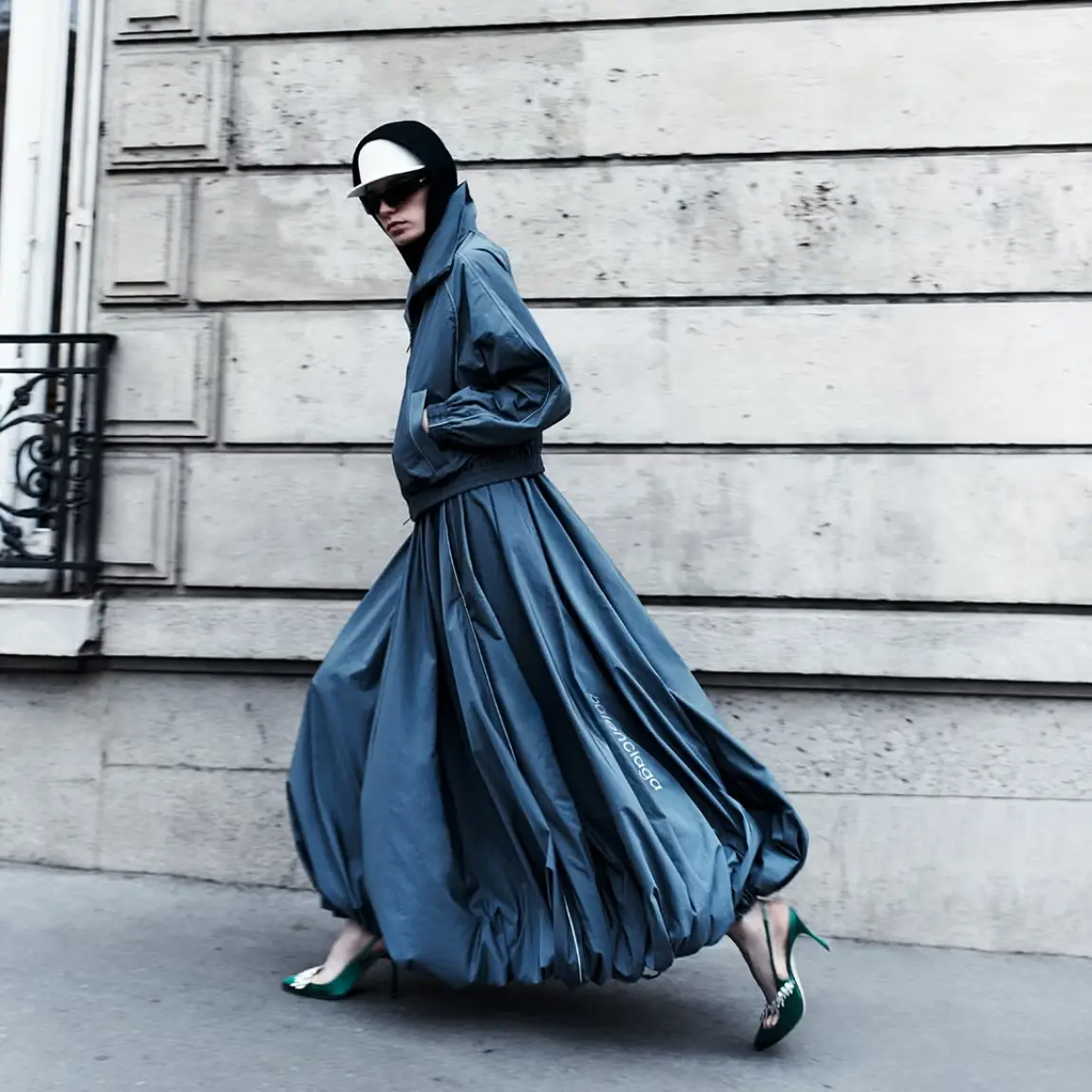 Piccioli debutó su visión para Balenciaga en octubre del año pasado con una colección que entrelazaba referencias de todos sus predecesores —Cristóbal Balenciaga, Nicolas Ghesquière y Demna— con un foco en siluetas refinadas y provocadoras. Esta temporada profundiza en esas contradicciones. En su recorrido por los archivos, Piccioli demuestra algunos de los mayores logros de Cristóbal en la construcción de un eveningwear que se traduce al terreno casual. Reaparece, por ejemplo, un guiño recurrente a la colección Invierno 1966: una capucha dramática llevada sobre una gorra de lana de visera corta y copa alargada. La versión actual extiende apenas la visera, conservando el efecto.