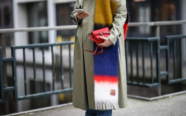 No es propiamente una bufanda, pero es un digno sustituto: un suéter atado alrededor del cuello, ideal cuando queremos llevar una prenda extra sin ponérnosla realmente. En este look, el suéter color caramelo se lleva como una maxibufanda sobre un trench de corte clásico, anudado junto a un pañuelo estampado de seda, creando un layering interesante de tejidos y volúmenes diferentes.