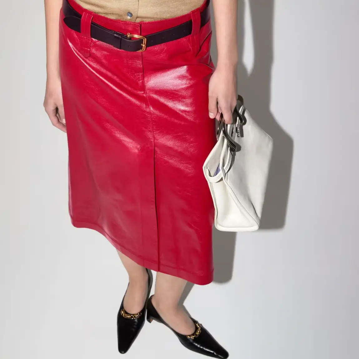 ¿Y en la parte superior? Este no es uno de esos looks que exige mostrar el abdomen. Un top de cuerpo completo en una talla mayor —como camisas oversize o cárdigans largos— aporta volumen y contrasta con la línea depurada de la falda. Para modelos con más movimiento, prueba con un tank top largo o un body para un efecto opuesto.