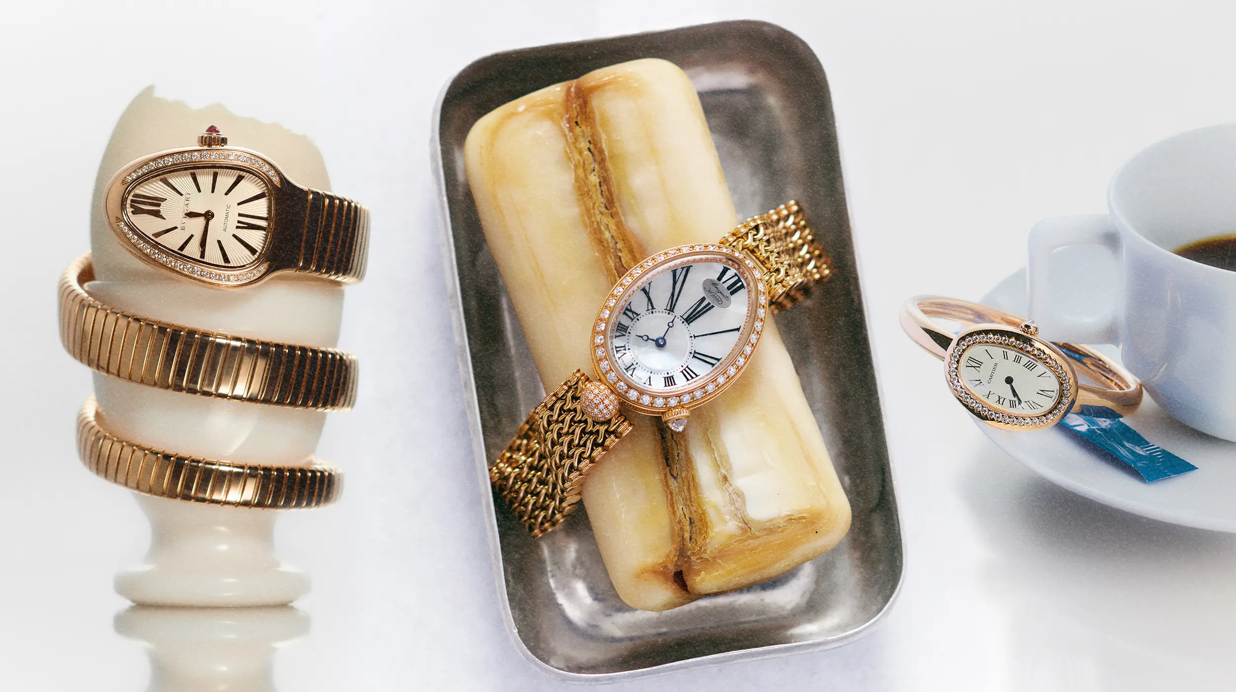Un modelo Reine de Naples, inspirado en el primer reloj de pulsera creado por Breguet para Carolina Bonaparte, presenta una esfera con pavé de diamantes, con corona, bisel, rehaut y hebilla, también adornados con diamantes, BREGUET. Fotografía: Pauline Caranton.
