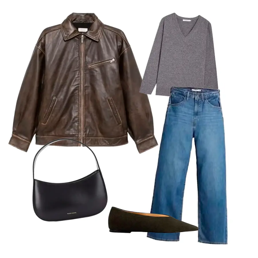 Si planeas invertir en una bomber jacket color marrón, considérala una prenda clave que podrás combinar con todos tus clásicos: suéteres con escote en V, jeans de corte recto y mocasines. Por otro lado, unos pantalones de cuero pueden verse igual de bien con una camisa de popelina y una chaqueta estilo barn, que con una blusa de seda. Para una interpretación más femenina del cuero, apuesta por una falda midi combinada con un suéter tejido o un cuello de tortuga de cachemira.