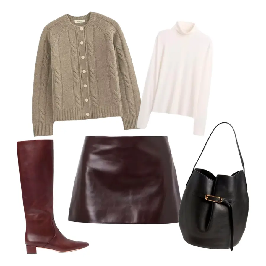 Esta temporada es el momento ideal para perfeccionar el arte de las capas. A medida que bajan las temperaturas, querrás recurrir a todos tus básicos para combinar con tu nueva minifalda de cuero. Para un look pulido, apuesta por un cárdigan acogedor y un cuello de tortuga ligero, complementados con botas hasta la rodilla.