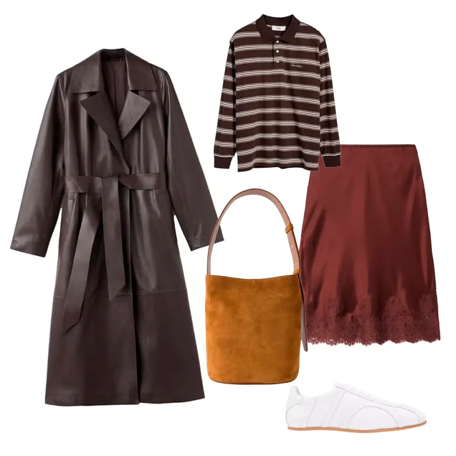 ¿Hay algo más sofisticado que un trench coat de cuero suave y flexible? La versión de Mango es una verdadera joya asequible y se ve espectacular, combinada con una camiseta deportiva de rayas de manga larga, una falda de seda con encaje y unas zapatillas retro.