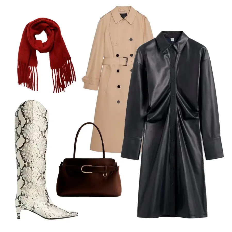 Un vestido de cuero es una inversión. Su silueta minimalista permite infinitas combinaciones, garantizando que lo uses una y otra vez. En este caso, llévalo con una de las grandes tendencias de calzado: botas hasta la rodilla con estampado de serpiente y un bolso de gamuza marrón para una salida nocturna con amigas. Cuando bajen las temperaturas, superpón tus imprescindibles de temporada —como un trench color caqui y una bufanda cálida—. Si buscas un look más profesional, cambia las botas por tacones y suma un blazer para llevarlo a la oficina.