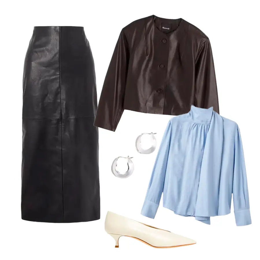 Combinar cuero con cuero no tiene por qué ser intimidante. Aquí te mostramos cómo hacerlo funcionar incluso en un entorno profesional. Comienza eligiendo siluetas adecuadas para el trabajo en este lujoso material: una falda lápiz y una chaqueta de corte femenino son la dupla ideal. Complementa el conjunto con una blusa con lazo y unos kitten heels en un tono contrastante, el color crudo siempre aporta un toque distintivo. Finaliza con joyería plateada discreta y un bolso de trabajo estructurado para un acabado impecable.