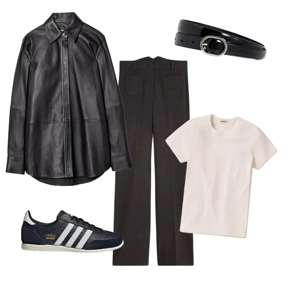 No hay nada como una camisa de cuero con corte sastre. Es una prenda perfecta para superponer durante los meses fríos y se lleva con facilidad sobre una camiseta y pantalones de pierna ancha. Para un aire relajado y moderno, completa el conjunto con unas zapatillas Adidas, aprobadas por el street style.