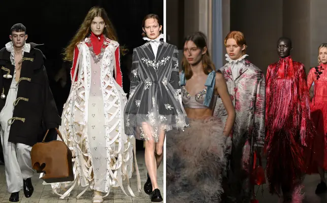 En Erdem apareció como extensión de su narrativa romántica, delicada, trabajada en capas y superpuesta sobre líneas estructuradas que equilibran fragilidad y contención. En cambio, Richard Quinn llevó el encaje hacia un territorio más teatral, incorporándolo en total looks de alto impacto, donde la textura se convirtió en protagonista absoluta. Su propuesta reforzó el dramatismo característico de la firma.