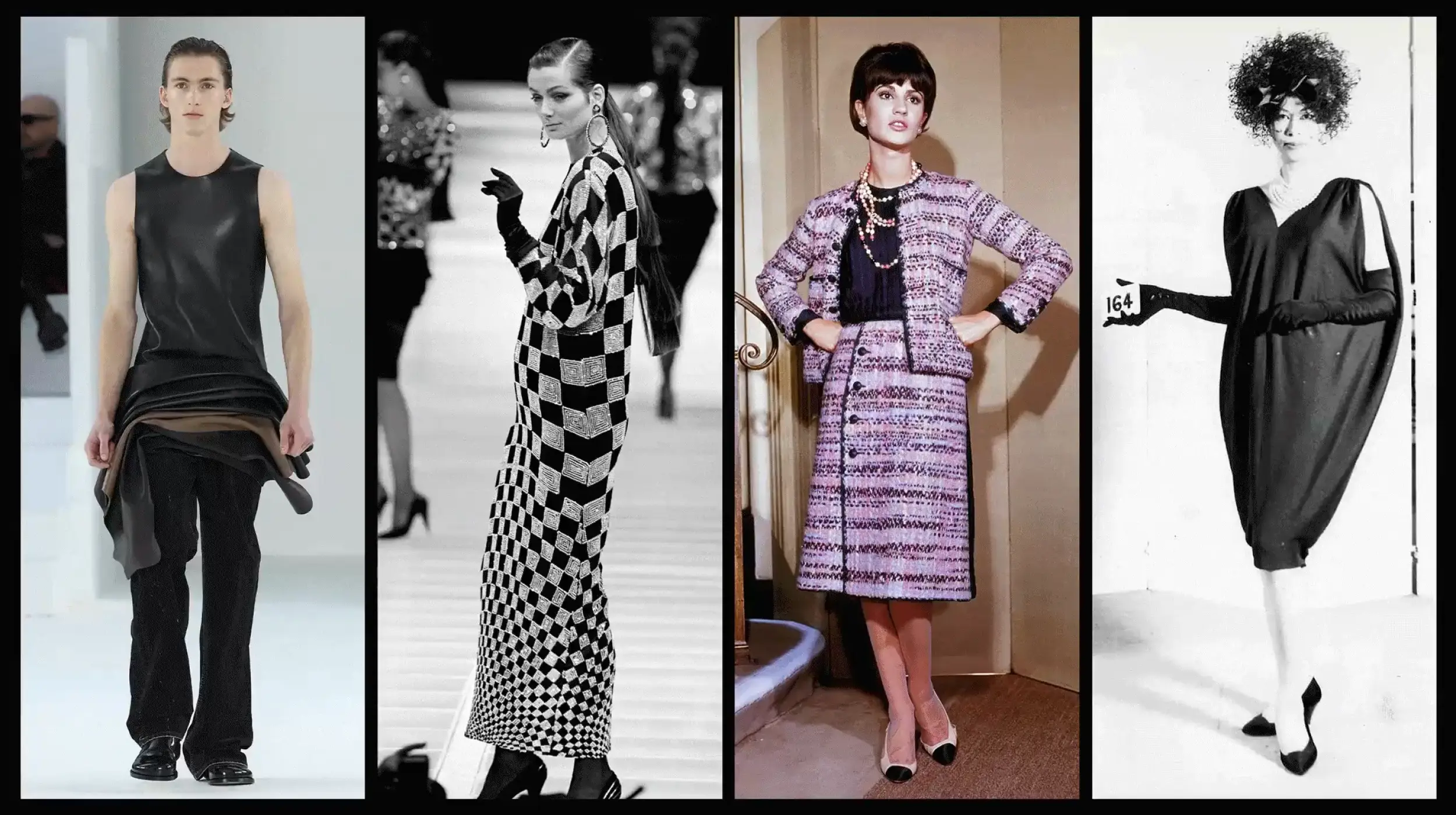 La casa Chanel cuenta con más de un siglo de historia y, por tanto, con innumerables épocas de las cuales inspirarse. Matthieu Blazy reinterpretó elementos tanto de los diseños de Gabrielle “Coco” Chanel como de su estilo personal, en especial su admiración por la estética tomboy, reflejada en las siluetas rectas y sueltas de los años veinte y en el uso de prendas masculinas adaptadas al vestuario femenino. Incorporó cinturas bajas con cinturón en muchas de sus piezas, un detalle característico de la diseñadora. Además, rindió homenaje a los elementos clave de los icónicos trajes de falda de Chanel de las décadas de 1950 y 1960, como las chaquetas de tweed de corte cuadrado —ya convertidas en un sello de la maison— y las siluetas abotonadas que envuelven la figura.