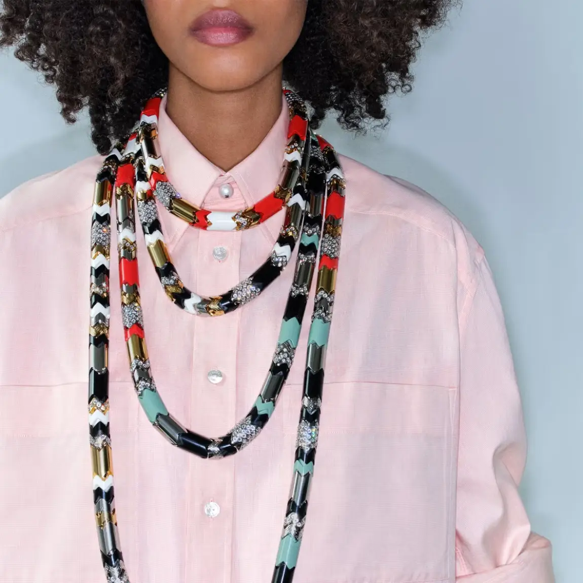 Si hay algo que nunca pasa de moda, son las camisas de botones coloridas y qué mejor manera de animarlas que con un collar divertido. El maximalismo dominó las pasarelas de esta temporada, no solo en forma de capas de camisas, sino también de collares superpuestos.