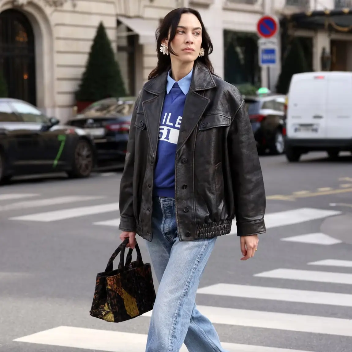 Los bombers de cuero han vuelto con fuerza y la versión de Mango de Alexa Chung demuestra el atractivo de un acabado perfectamente usado. Además, ha llevado este bolso patchwork de Prada durante más de una década, un recordatorio de que modelos similares de Miu Miu bien valen la inversión.