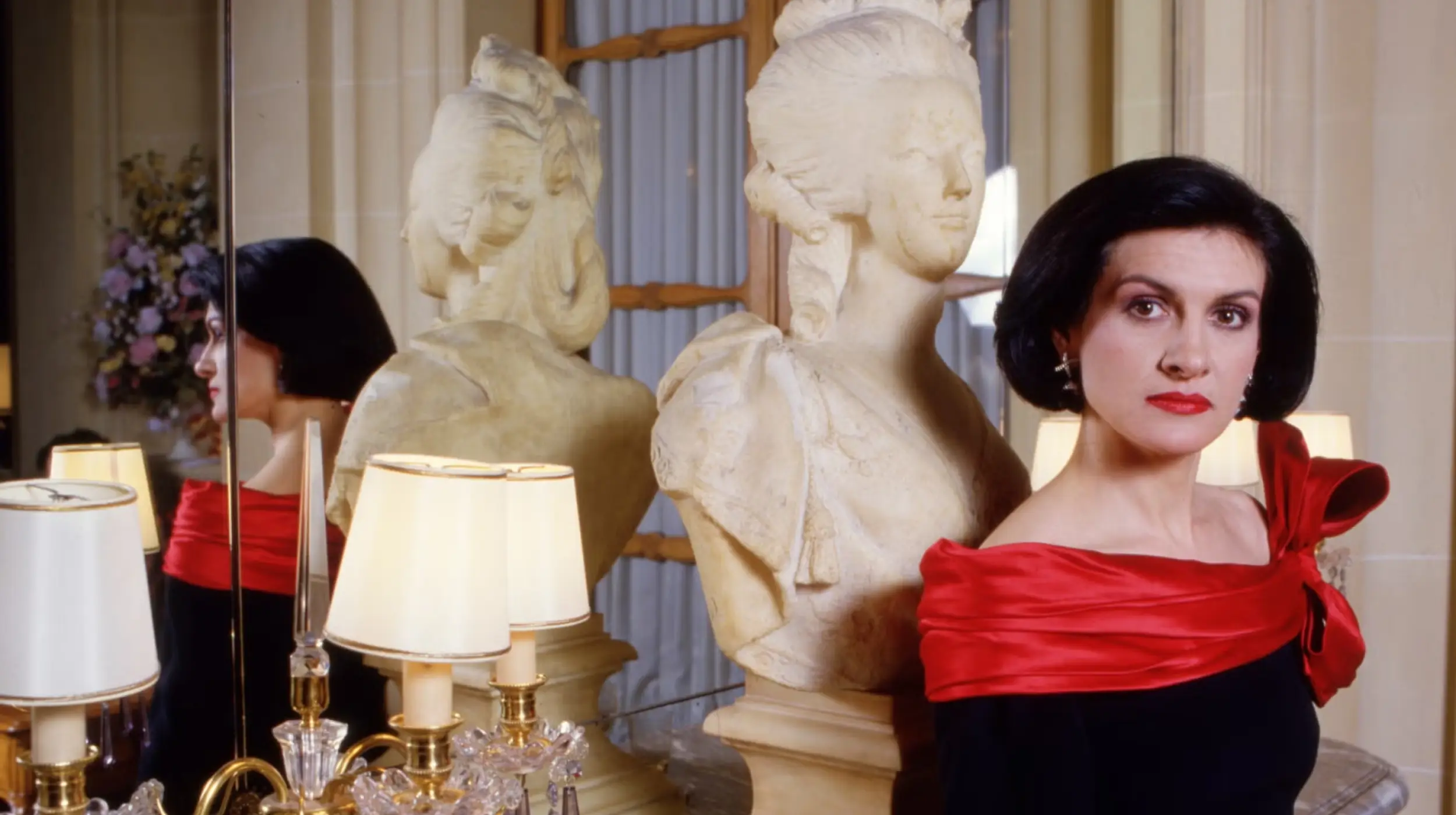 En fotos de archivo y en sus apariciones públicas se reconoce una misma línea de estilo, con labios rojos, siluetas limpias, tejidos con caída y la joya en primer plano. En los 70 y 80 esa preferencia se veía en el escote retrato —que envuelve los hombros como si fuese un chal—, en los hombros definidos y en la combinación de negro con rojo, una dupla que solía completar con cadenas largas y collares de lapislázuli para alargar la figura.