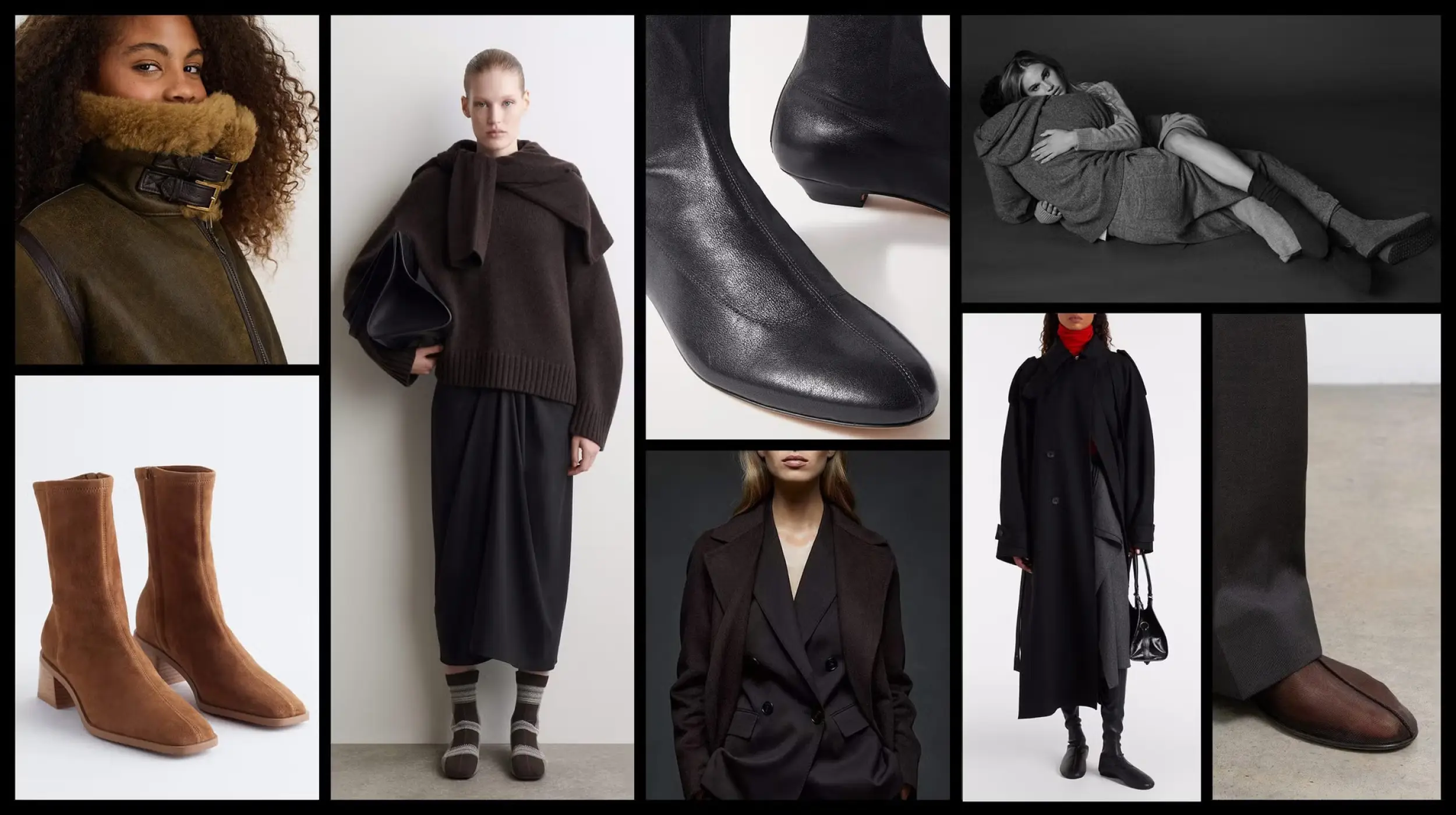 Si las sock boots ya se sienten un poco rebeldes, abraza completamente esa idea con una combinación negro y marrón. Un abrigo chocolate y un pequeño vestido negro pueden acompañarse con unas botas estampadas para que el contraste se vea intencional, no accidental.