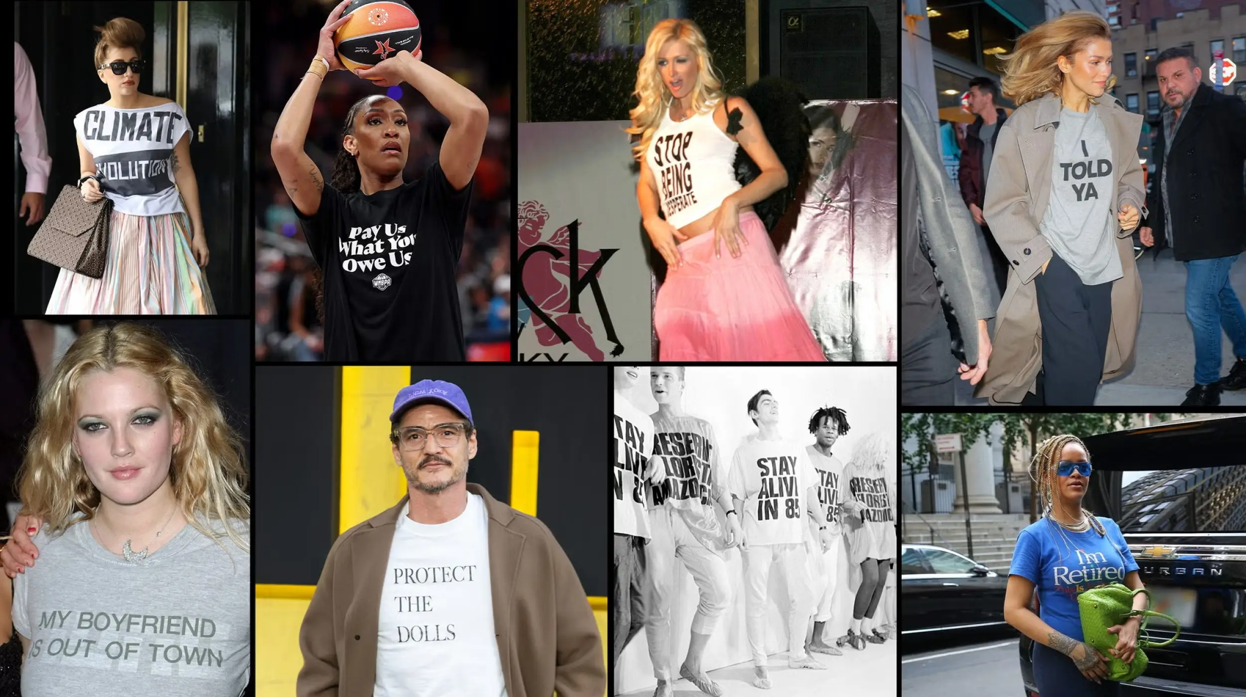 Pedro Pascal con una camiseta gráfica con el lema “Protect the Dolls” (Protejan a las muñecas), que se convirtió en un símbolo de apoyo a la comunidad transgénero.