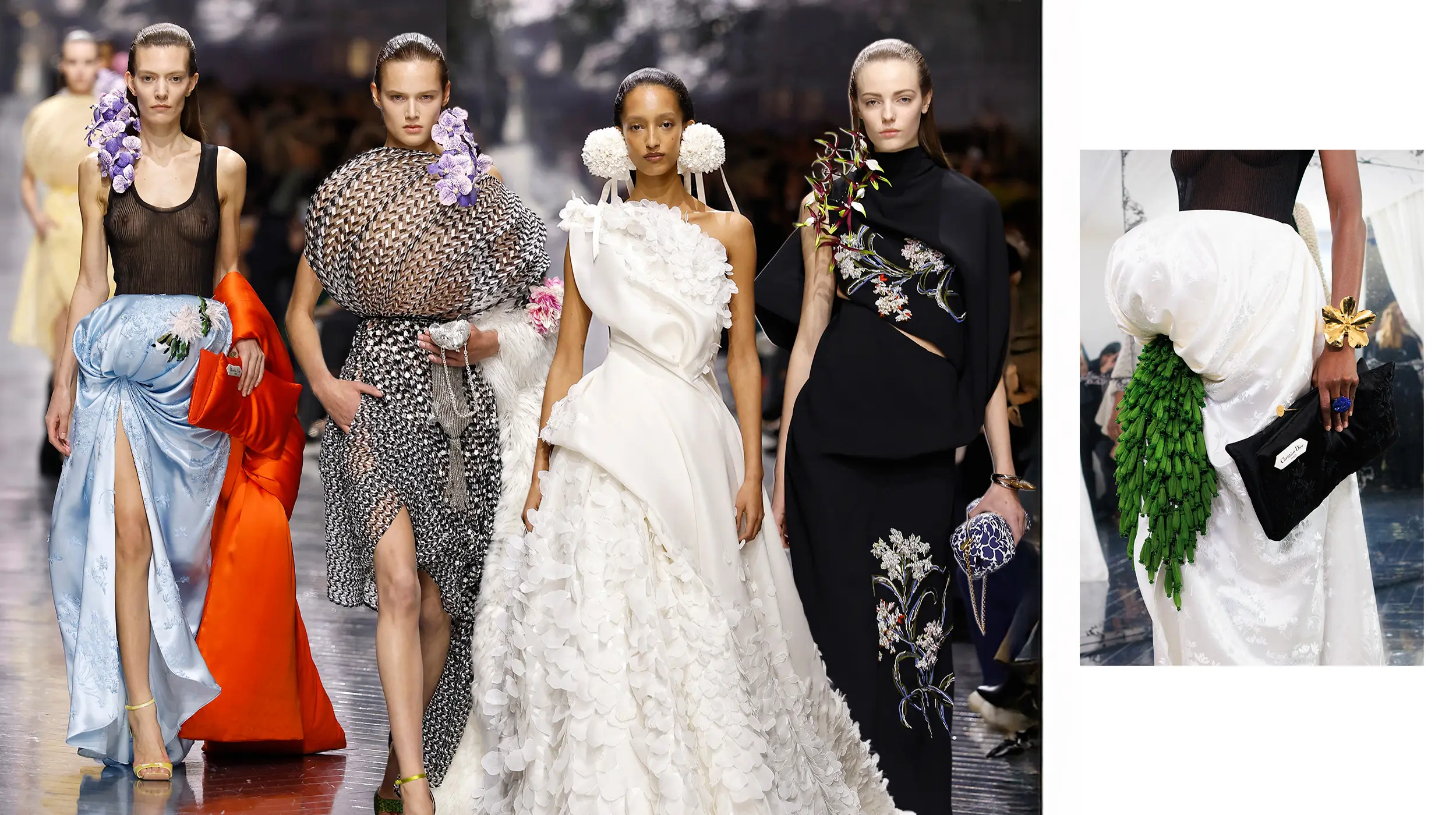 El punto de partida conceptual fue la naturaleza, entendida como un sistema vivo y en constante transformación. Esa idea se tradujo en flores que aparecieron suspendidas en el espacio y reinterpretadas como accesorios, especialmente en los pendientes, así como en siluetas fluidas construidas a partir de capas de chiffon y organza. Las prendas se movían con facilidad, alejándose de la rigidez que suele asociarse a la alta costura, sin perder complejidad técnica.