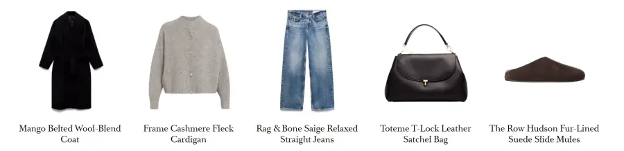 A veces, las combinaciones más simples son las más efectivas. Unos jeans rectos de tiro bajo, combinados con un cárdigan de corte cuadrado, crean una base cómoda y relajada. Añade un abrigo oversize, un bolso estructurado tipo T-lock y zuecos minimalistas para elevar el conjunto sin esfuerzo.