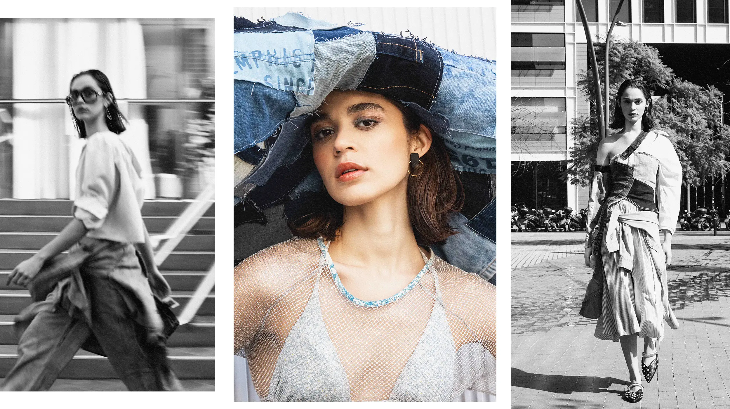 Un trabajo que explora el denim como lenguaje universal de estilo, mezclando texturas, capas y siluetas urbanas en escenarios arquitectónicos contemporáneos.